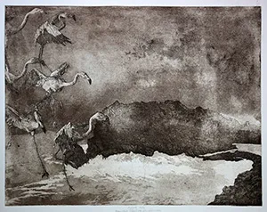 Verunsicherte Flamingos über stürmischer Bucht