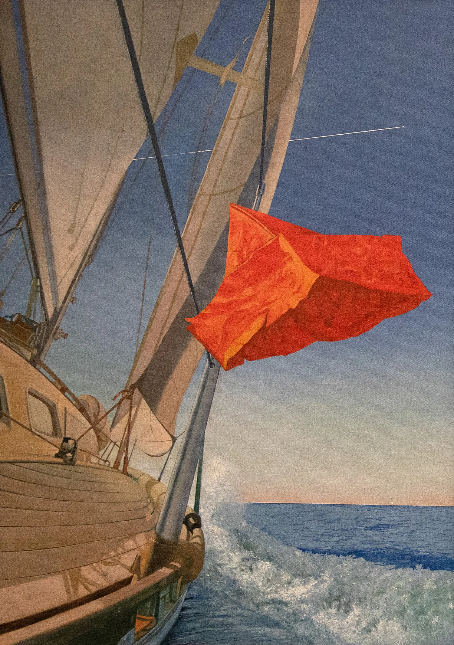 Die optische Attraktion des roten Hutes vor der blaugrauen Fläche des hohen Himmels und die gelbbraune Komplementärfarbe der Segel und des Bootskörpers sind bestimmend für die Wirkung dieses Bildes; trotz der vorgetäuschten Bewegung von links unten nach rechts oben strahlt die Situation eine angenehme, entspannte Ruhe aus, die übrigens für die gesamte Zeit des Segelturns unsere Tage in der Ägäis bestimmte.